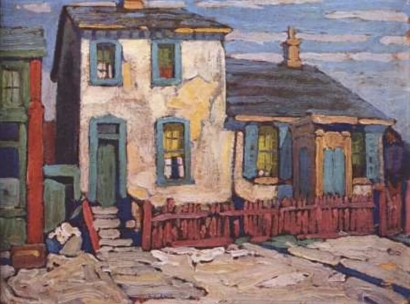 Response: "The image depicts a quaint, weathered house with a barren yard, appearing to be captured during a period of neglect or transition. Perhaps the dilapidated state suggests an eloquent tale of past liveliness. A short, reddish-brown fence runs alongside the property, possibly serving as a boundary between public and private spaces. The house is painted in muted, pastel hues, with hints of blue and green adorning its windows and doors, creating an impression of faded charm. The artist has used broad strokes that suggest a light touch, much like the soft and gentle essence one might associate with patterns of calm rainfall. The soft interplay of light and shadow on the rooftop could evoke a serene atmosphere, as if nature itself is whispering secrets to the silent dwelling. Outdoors, scattered items and materials indicate an evolving or shifting narrative of the home's purpose, enhancing the subtle narrative of change and resilience in an urban or suburban setting.”