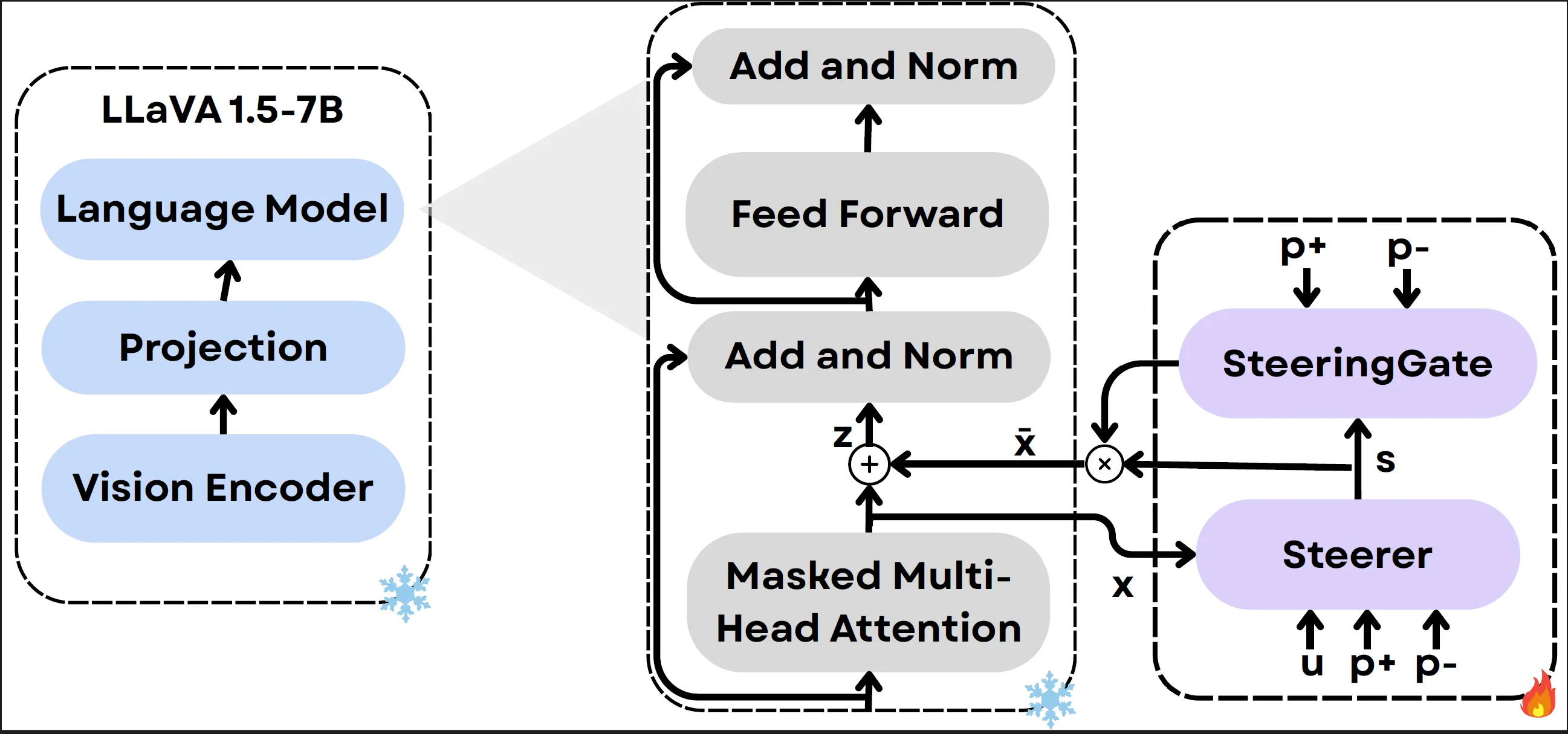 The SteerVLM module is hooked into the VLM’s language decoder right after the multi-head attention layer, where it modulates the post-attention activations enabling fine-grained, layer-agnostic steering.