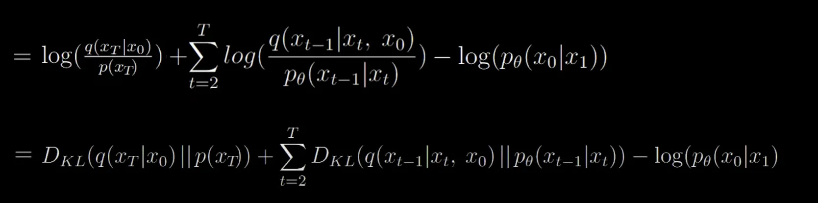 In terms of meaning: divergence between forward diffusion conditioned on initial image and final parameterized image + sum of divergence at every time step between the forward diffusion and corresponding reverse diffusion process of model subtracted by the