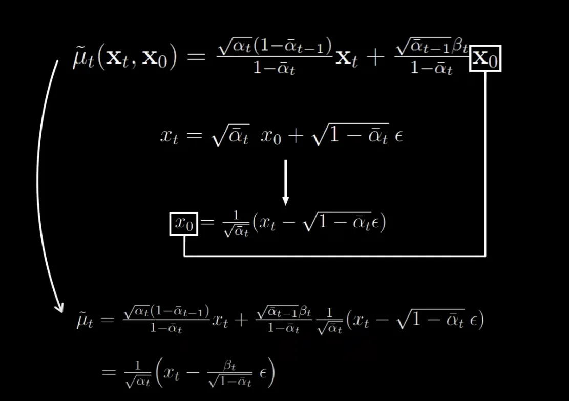 It is all simplified in the form of and we dont need anymore. It can also be seen that the mean value is just subtracting a scaled value (noise) from (input to the model). The value here is the actual or ground truth value.